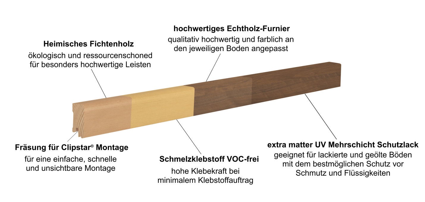 Bei CUBE 58 handelt es sich um Echtholz furnierte Sockelleisten mit einem Massivholzträger aus heimischem Fichtenholz. Um das Fichtenholz noch besser nutzen zu können und somit dem ökologischen Gedanken Rechnung zu tragen wird das Trägermaterial zusätzlich keilgezinkt. Im Vergleich zu Leisten mit einem MDF oder HDF Trägermaterial entsteht so eine wesentlich höherwertigere und schönere Sockelleiste. Bei der Verklebung des Edelholz-Furniers vertrauen wir ganz auf einen Schmelzklebstoff der Firma Jowat aus dem deutschen Detmold. Dieser Klebstoff garantiert maximale Klebekraft bei minimalem Verbrauch. Aber vor allem aufgrund seiner VOC-freien Rezeptur ist dieser Klebestoff die erste Wahl bei vielen Sockelleistenproduzenten denen gesunde Raumluft am Herzen liegt. Optisch veredelt werden unsere CUBE Sockelleisten von einem Furnier aus Echtholz, das dem jeweiligen Farbton des Bodens optimal angepasst wird. Dadurch erhalten Sie den bestmöglichen Abschluss für Ihren hochwertigen Parkettboden. Zum Schutz gegen Schmutz und Flüssigkeiten werden die Leisten zu guter Letzt noch mit einem extra matten Mehrschichtlack der Firma Kneho aus Horn-Bad-Meinberg überzogen. Aber auch auf die Befestigung wurde nicht vergessen, so sind alle unsere CUBE-58 Leisten standardmäßig mit einer Clipstar® Fräsung versehen. Dies garantiert eine schnelle und unsichtbare Montage aller unserer Sockelleisten.