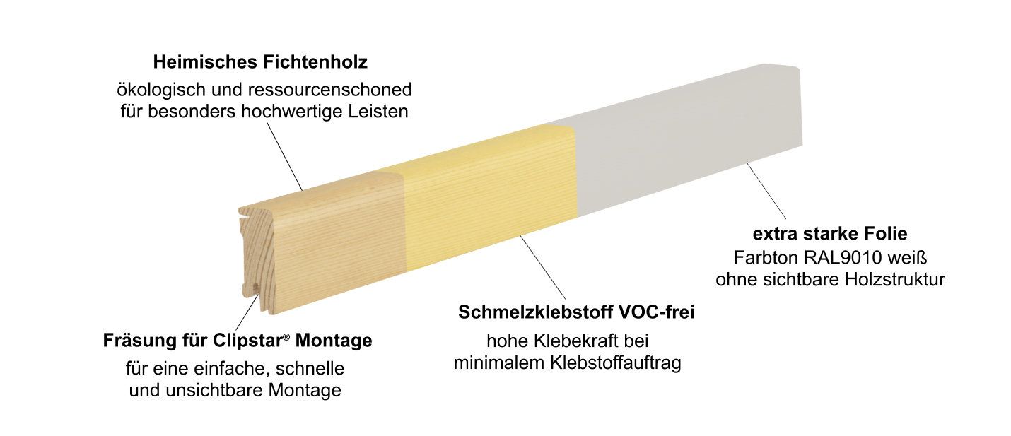 Bei CUBE 40 weiß handelt es sich um Echtholz folierte Sockelleisten mit einem Massivholzträger aus heimischem Fichtenholz. Um das Fichtenholz noch besser nutzen zu können und somit dem ökologischen Gedanken Rechnung zu tragen wird das Trägermaterial zusätzlich keilgezinkt. Im Vergleich zu Leisten mit einem MDF oder HDF Trägermaterial entsteht so eine wesentlich höherwertigere und schönere Sockelleiste. Bei der Verklebung der extra robusten Spezialfolie vertrauen wir ganz auf einen Schmelzklebstoff der Firma Jowat aus dem deutschen Detmold. Dieser Klebstoff garantiert maximale Klebekraft bei minimalem Verbrauch. Aber vor allem aufgrund seiner VOC-freien Rezeptur ist dieser Klebestoff die erste Wahl bei vielen Sockelleistenproduzenten denen gesunde Raumluft am Herzen liegt. Optisch sticht vor allem die hochwertige Spezialfolie im Farbton weiß RAL9010 ins Auge, sie bittet den bestmöglichen Abschluss für Ihren hochwertigen Parkettboden. Aber auch auf die Befestigung wurde nicht vergessen, so sind alle unsere weißen Sockelleisten standardmäßig mit einer Clipstar® Fräsung versehen. Dies garantiert eine schnelle und unsichtbare Montage.